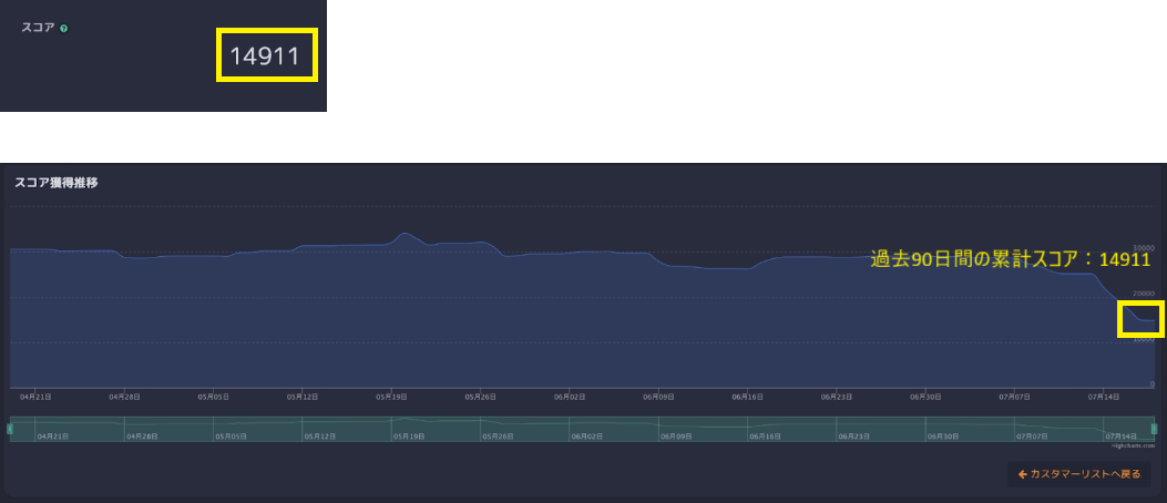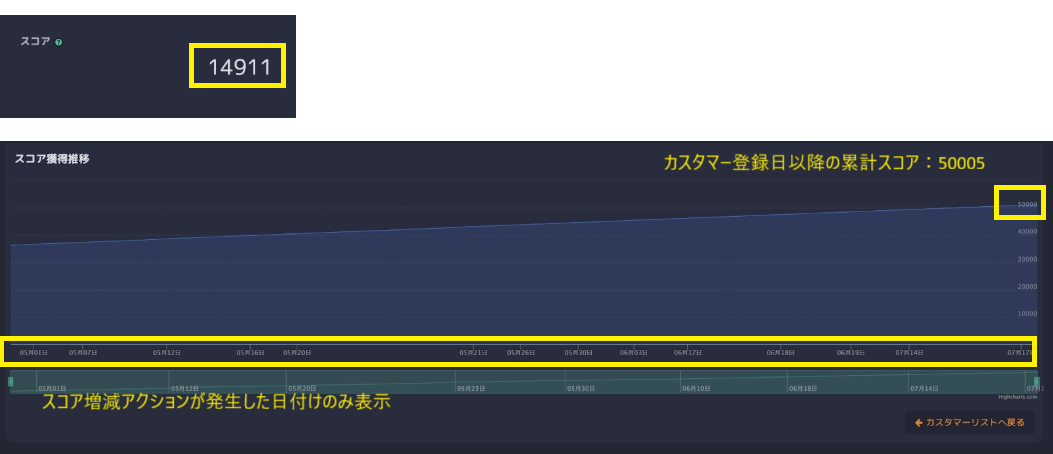 - 縦軸(y軸):カスタマー登録日から、横軸に表示された日付までに蓄積された累計スコアを表示
