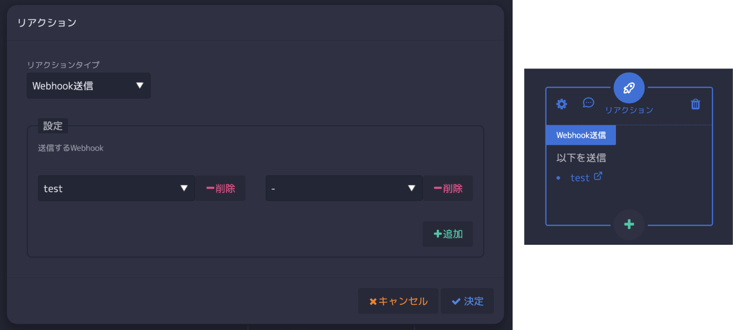 今回のアップデートにより、リアクションとして「Webhook送信」が新たに選択可能になるほか、「社内通知メール」の送信先指定範囲が拡張されます。