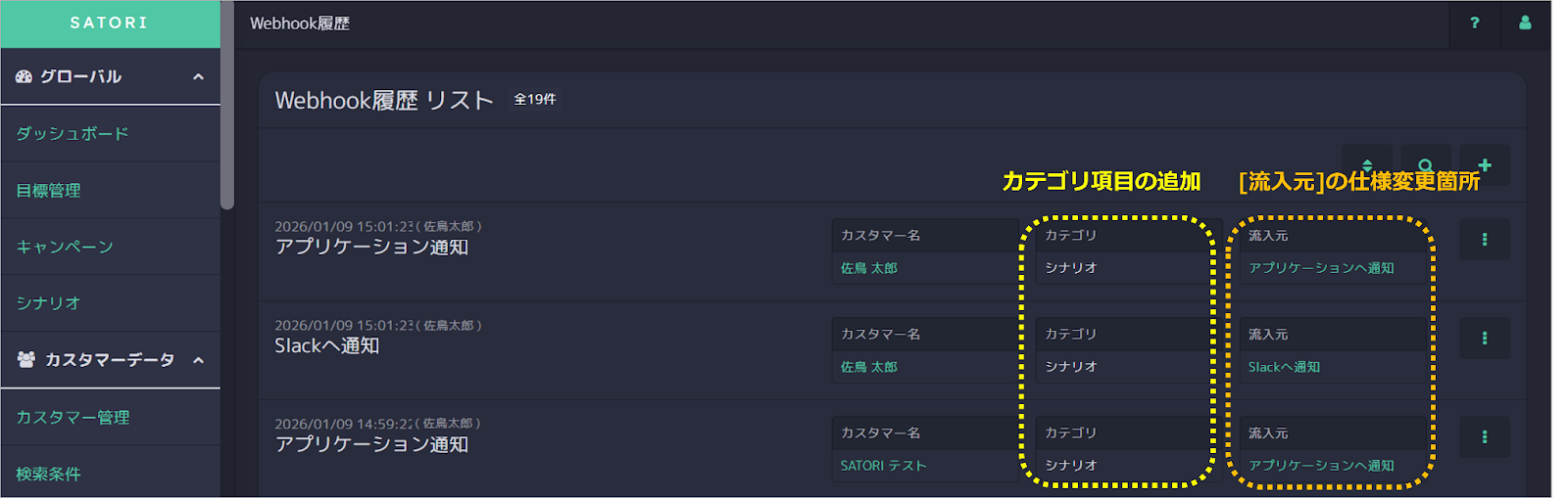 検索画面に「カテゴリ」の項目が追加されます。これにより、シナリオで送信したwebhookの検索が可能となります。